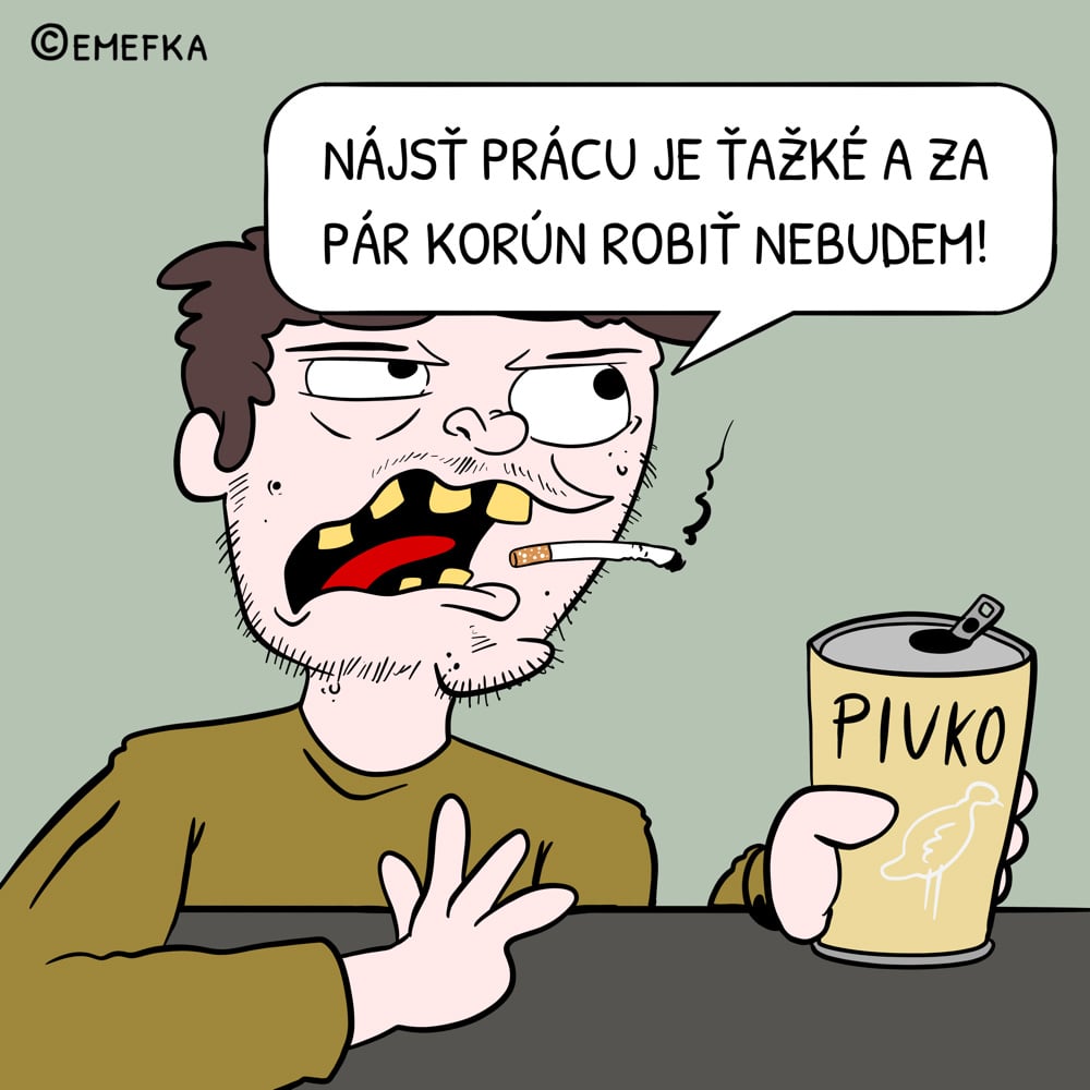 Za almužnu pod nikým otročiť nebudem,“ hovorí a razí z neho presne tak, ako by si čakal. Zaparkovaný vo svojom obľúbenom pajzli si ústa máča už v treťom pive za sponzorský dar od zúfalej manželky, ktorá nebola ochotná po zvyšok dňa čuchať jeho výpary.