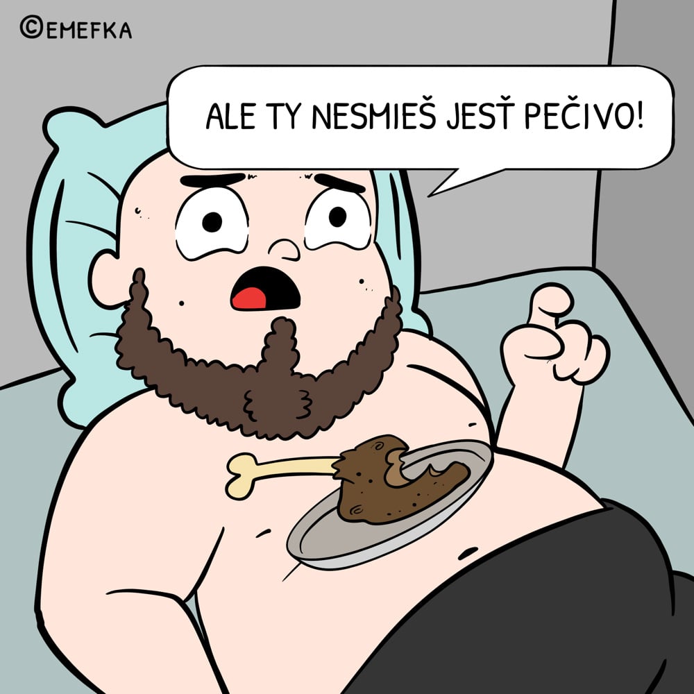 „Ja by som do tej nízkosacharidovej diéty nikdy nešiel. Veď uvidíš za desať rokov, telo ťa potrestá,“ hovorí, zatiaľ čo si z prstov oblizuje zvyšky – akéhosi nutrične určite prudko bohatého – sajrajtu. Očividne sa vyzná. Vie, že mrkva sa preceňuje a všetky tie drísty o škodlivosti bielej múky šíria ovce, ktoré v tridsaťpäťke otrčia kopytá kvôli kardiovaskulárnemu ochoreniu. Očividne.