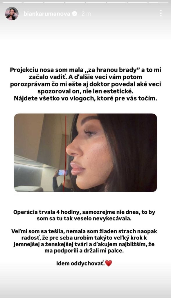 „Už minulý rok som sa rozhodla pre zmenu. Tak som sa teda vydala na cestu za ňou. Prvým krokom bolo nájsť profíka, ktorý by mi túto premenu zrealizoval čo najšpičkovejšie. Už zrejme viete o čom hovorím. Tak to nebudem ďalej naťahovať keď už mám aj tak po a chcela som vám dať vedieť keď to budem mať úspešne za sebou. Rozhodla som sa ísť na operáciu nosa,“ napísala fanúšikom Bianka.