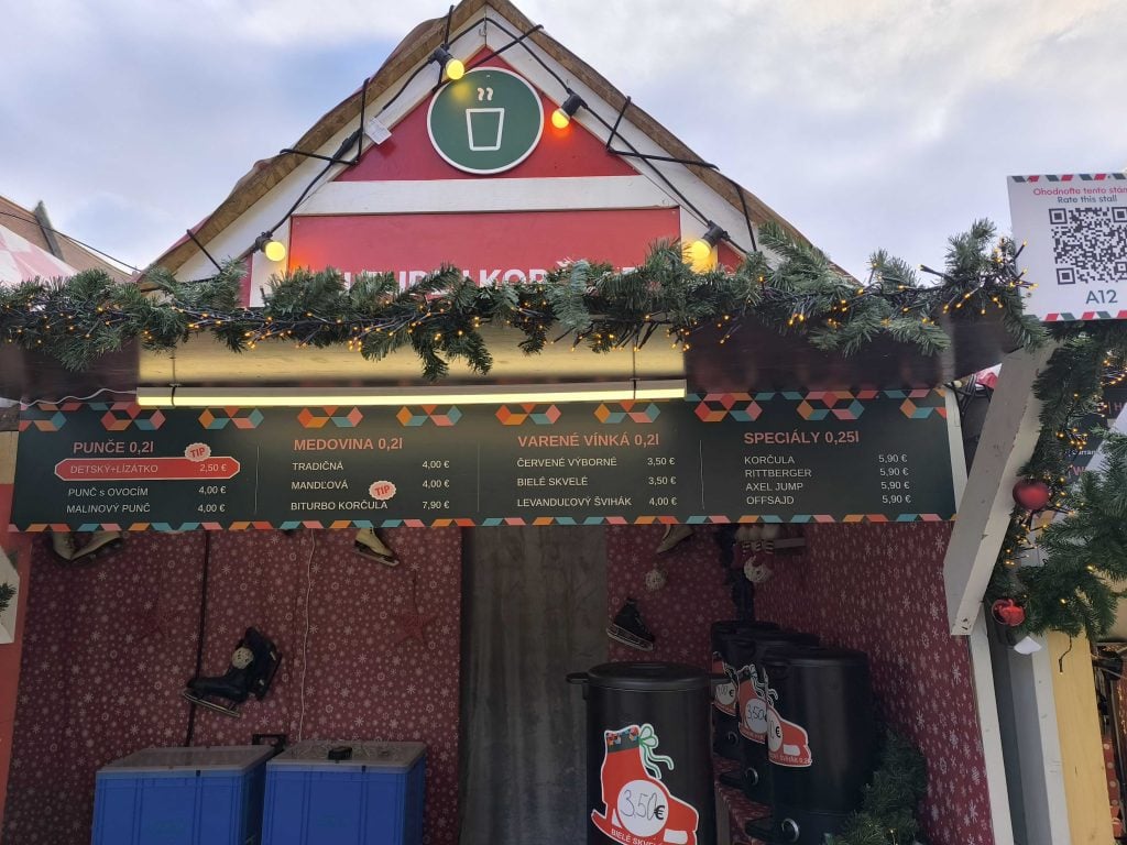 Ceny vareného vína či punču sa pohybujú pri rôznych stánkoch vo veľmi podobných sumách – za dve deci dáš prevažne 3,50 eura. Medovina stojí najmenej 4 eurá. Ak ti klasický punč nestačí a chceš sa rýchlejšie „dostať do nálady“, môžeš si kúpiť aj turbo punč.