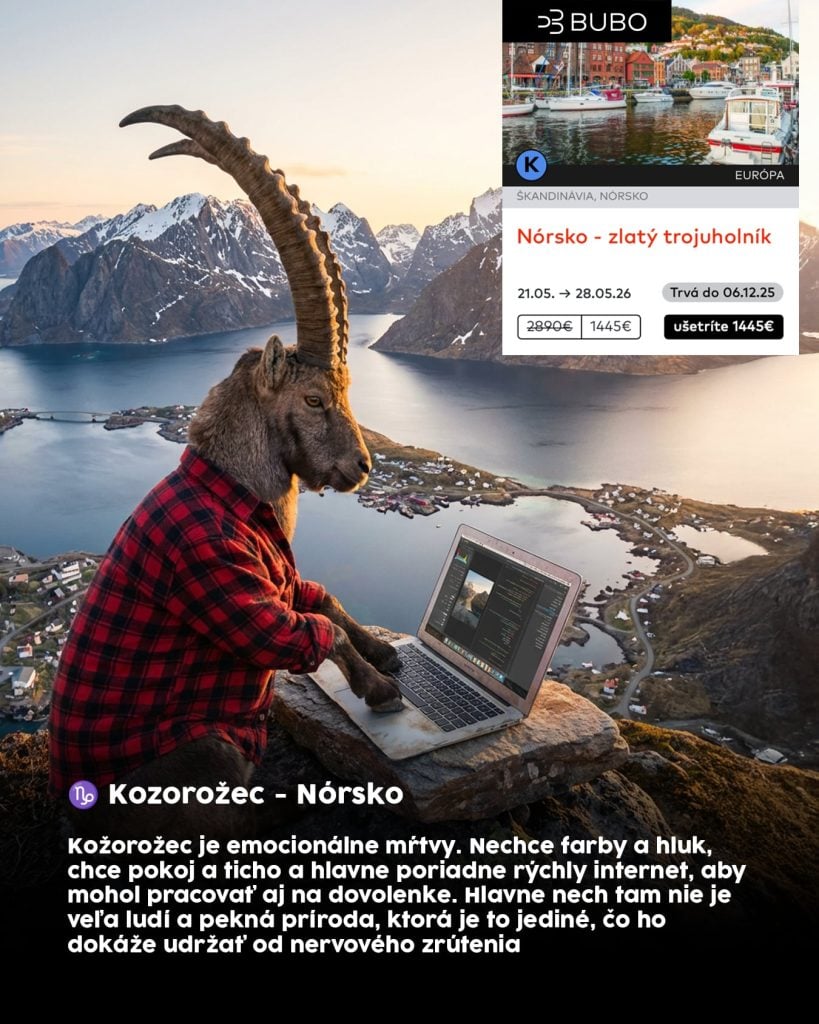 Kozorožec na dovolenke? To je vlastne oxymoron. Potrebuje ticho, minimum ľudí a internet rýchlejší než jeho úzkosti, aby mohol pokračovať v práci aj s výhľadom na fjordy. Emócie neprejavuje, farby ho rušia a prílišná zábava ho stresuje, takže chladné, pokojné Nórsko je preňho raj. Ideálne, ak je vonku zima – aspoň má zámienku neísť medzi ľudí. Jedine krásna príroda ho dokáže udržať ďaleko od nervového zrútenia, a aj to len na pár hodín, kým si neotvorí laptop „len na chvíľku“. Ale úprimne? On je tu vlastne spokojný. Funguje, pracuje, dýcha. To stačí.