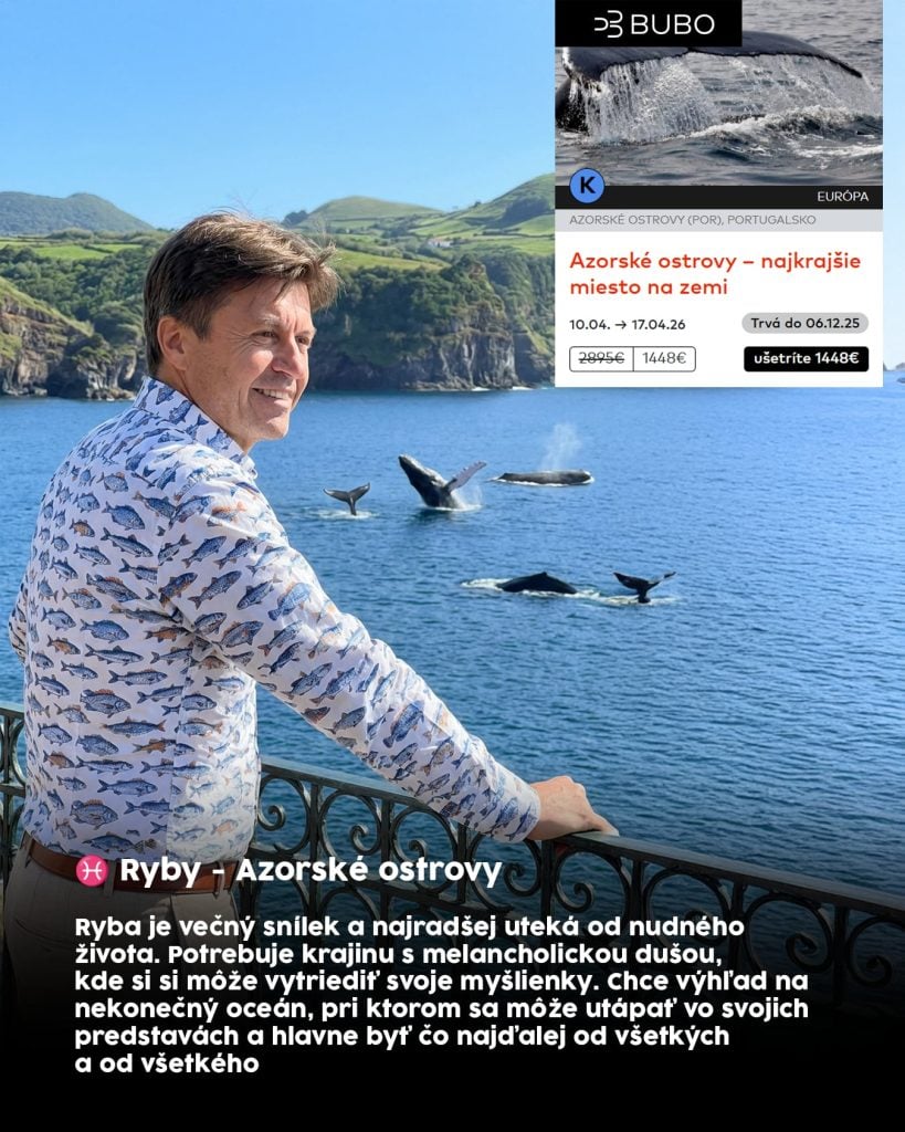 Ryby sú večné duše básnikov, ktoré najradšej utekajú od reality tak ďaleko, ako im kreditka dovolí. Azory sú ich vysnívaný únik – melancholická príroda, dramatické útesy a oceán, ktorý im dá dovolenie konečne sa stratiť v myšlienkach. Ryba tu môže celé dni stáť na balkóne, pozerať sa na nekonečnú vodu a premýšľať, či je život náhoda, osud alebo len veľmi dlhý sen. Každý západ slnka si interpretuje ako osobný odkaz od vesmíru a potichu sa pritom dojme. Ryby potrebujú byť ďaleko od ľudí, problémov a povinností, aby mohli byť konečne samy sebou – poetickým, zasnívaným tvorom, ktorý niekde medzi delfínmi nachádza pokoj.