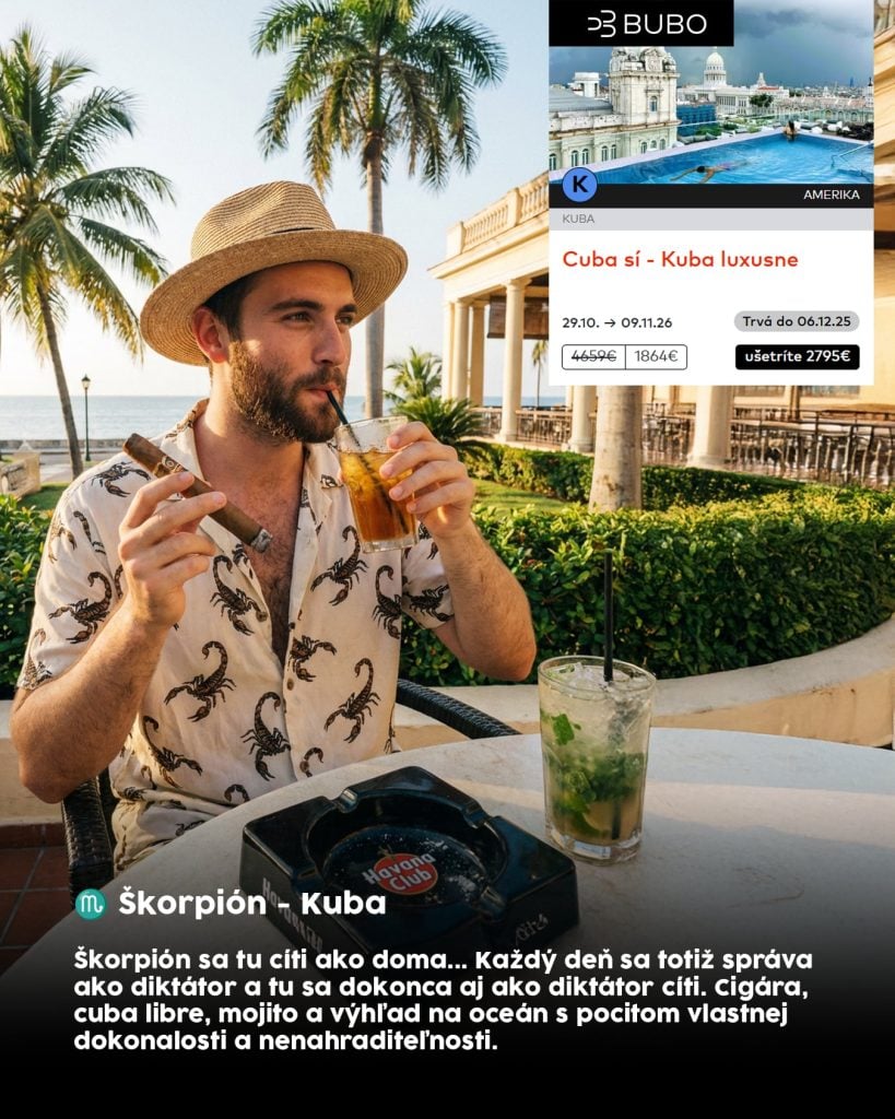 Škorpión sa na Kube cíti, akoby mal celé súostrovie prenajaté len pre seba. Miluje drámu, tajomno a atmosféru, ktorá zaváňa zakázaným – takže Havana je preňho čisté afrodiziakum. Ciga, cuba libre, mojito a výhľad na oceán mu dávajú presne ten vibe, v ktorom môže pôsobiť ako hlavná postava svojho vlastného filmu. Každý pohľad, každý pohyb a každý dúšok je taký teatrálny, až je to príťažlivé aj otravné zároveň. Na dovolenke tu prežíva pocit absolútnej sily, dokonalosti a nenahraditeľnosti. A úprimne? Trochu mu to aj veríme, lebo Škorpión má tú zvláštnu schopnosť pôsobiť ako niekto, kto to tu naozaj riadi.