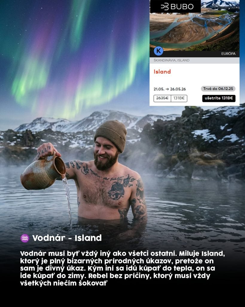 Vodnár musí byť iný, aj keby mal umrieť od zimy. Preto miluje Island – krajinu, kde aj príroda vyzerá, akoby vznikla omylom. Gejzíry, ľadovce, sopky, polárna žiara… presne toľko chaosu, koľko potrebuje jeho mozog, aby sa cítil “normálne”. Kým ostatní idú na dovolenku rozmraziť svoje telo, Vodnár si ide otužovať svoju dušu do vriacich jazier alebo ľadových riek. Žiadne teplé kúpele pri mori, on si radšej vlezie do niečoho, čo vyzerá ako miesto nehody. Je rebel bez príčiny, vizionár bez plánov a turistický úkaz, ktorý vždy šokuje všetkých okolo. A to je presne to, čo ho robí šťastným.