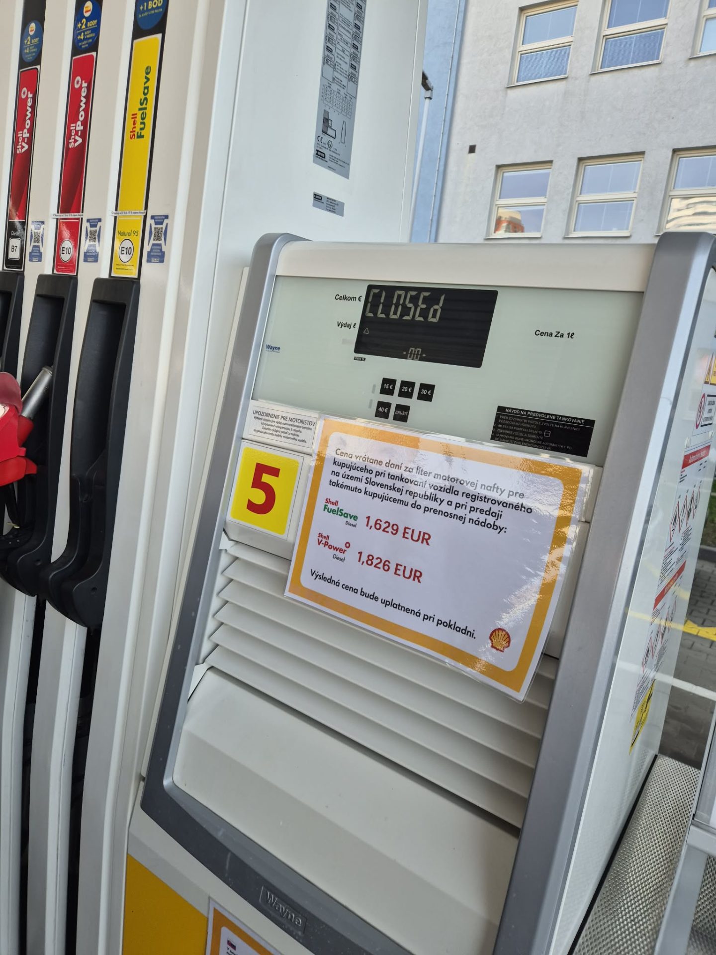 Ešte znepokojujúcejšie pôsobí samotný stav pumpy. Displej stojana hlási „closed“ a priestor je čiastočne ohraničený kužeľmi, čo naznačuje obmedzenú alebo úplne zastavenú prevádzku. Ide tak o ďalší dôkaz, že opatrenia už nie sú len na papieri – v realite znamenajú zatváranie stojanov, chaos na pumpách a čoraz väčšiu neistotu medzi vodičmi aj firmami.