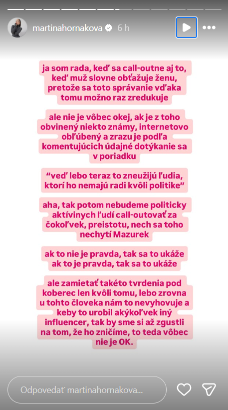 „Zametať takéto tvrdenia pod koberec len kvôli tomu, lebo zrovna u tohto človeka nám to nevyhovuje, a keby to urobil akýkoľvek iný influencer, tak by sme si až zgustli na tom, že ho zničíme, to teda vôbec nie je OK,“ napísala.