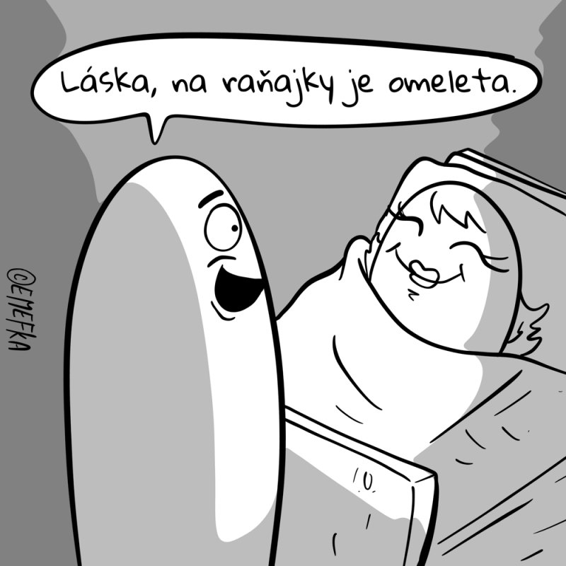 Ranné milovanie je fajn, ale povedzme si pravdu. Obom vám smrdí z úst, ste ulepení, pokrčení a o akejkoľvek fyzickej zdatnosti nemôže byť v tejto fáze reč, takže to zase až také terno nie je. Ale raňajky do postele? To už je o inom. Hovorí sa, že každá žena chce princa na bielom koni, ale pravdou je, že ten kôň nie je až taký podstatný. Budiť sa ráno na vôňu kávy a praženice, to je to, o čom to celé je. Ale nič proti koňom, kone sú fajn.