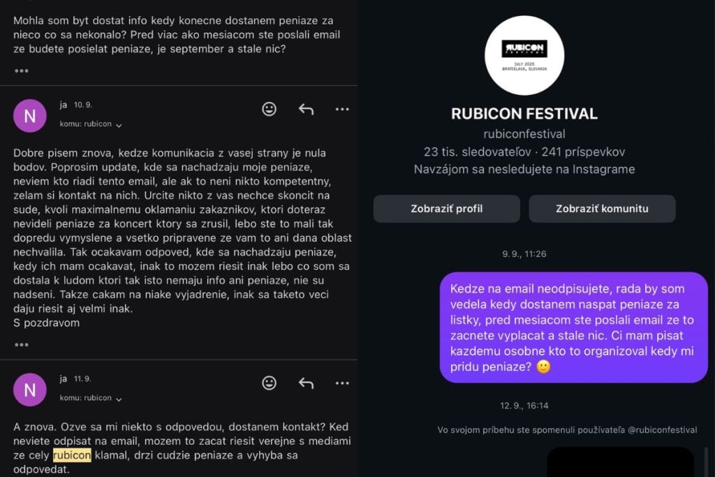 Na Instagrame majú organizátori festivalu vypnuté komentáre a na e-maily podľa slov ľudí nereagujú, takže majú obavy, že peniaze už neuvidia. „Keby aspoň s nami komunikovali, ale na e-maily neodpisujú, písala som im na Instagram, aj ich označila v storke. Vyhýbajú sa akejkoľvek komunikácii a akurát to vyzerá tak, že tie peniaze už nikto neuvidí,“ opísala Nika situáciu.