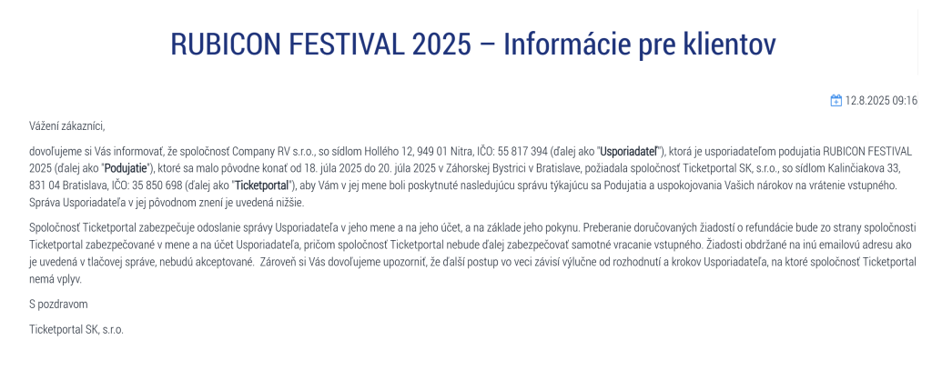 Rubicon Festival 2025 mal byť jedným z najväčších hudobných podujatí leta – od 18. do 20. júla sa v Záhorskej Bystrici očakávali tisíce fanúšikov a medzi hviezdami line-upu sa mal objaviť dokonca aj raper Kanye West. Za festivalom stála nitrianska spoločnosť Company RV s.r.o., no podujatie bolo nakoniec zrušené. O tom, ako prebehne vrátenie vstupného, informoval predajca Ticketportal. Ten však upozornil, že peniaze nebude vracať priamo, ale iba sprostredkuje žiadosti organizátorovi.