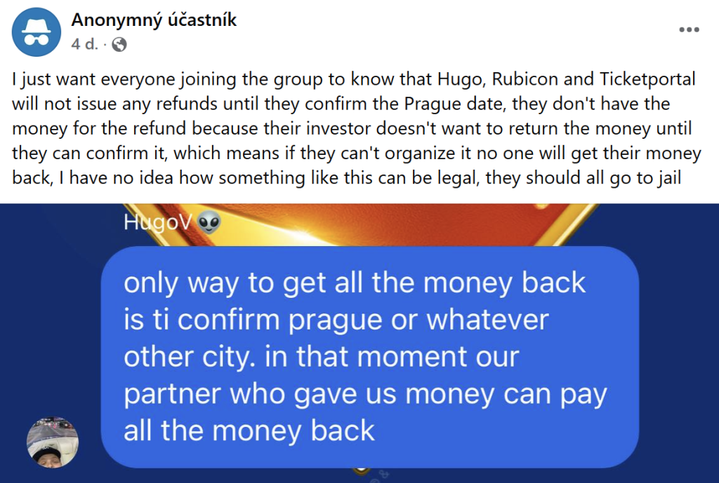Michal V. z Česka vysvetľuje, že spolu s priateľmi si zakúpili štyri vstupenky v celkovej hodnote približne 800 eur. Ako hovorí, komunikácia zo strany organizátorov prakticky neexistovala: „Len informácia, že spracovali žiadosť o refundáciu, a tam to celé skončilo.“