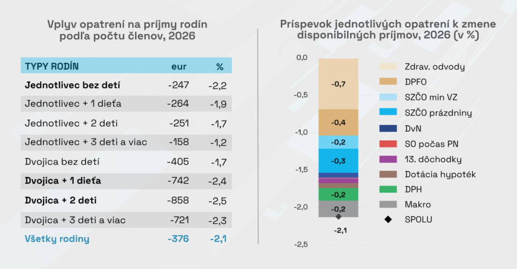 Analýza uvádza, že priemerná slovenská domácnosť prispeje na konsolidáciu verejných financií 376 € ročne. Dôchodcovia pocítia menšiu záťaž, rodiny s pracujúcimi tvrdší zásah a najviac stratí skupina SZČO, ktorá zaplatí cez 1000 € ročne. Opatrenia odborníci považujú za nevyhnutné, ale málo citlivé.