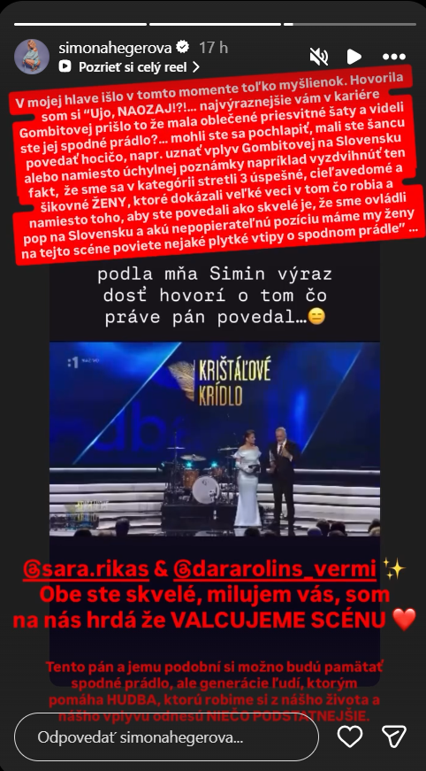 Moderátorka Krištáľového krídla potom Rosinovi, ako etiketa káže, poďakovala za tento šťavnatý príbeh. Diváci sa mohli len chytať za hlavu a pýtať sa, čo to vlastne malo znamenať? Nuž, reakcia Simy na seba nenechala dlho čakať. Na Instagrame už pristál jej názor na tento netradičný a šťavnatý príbeh.