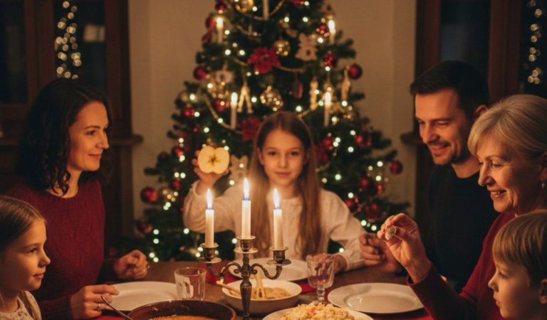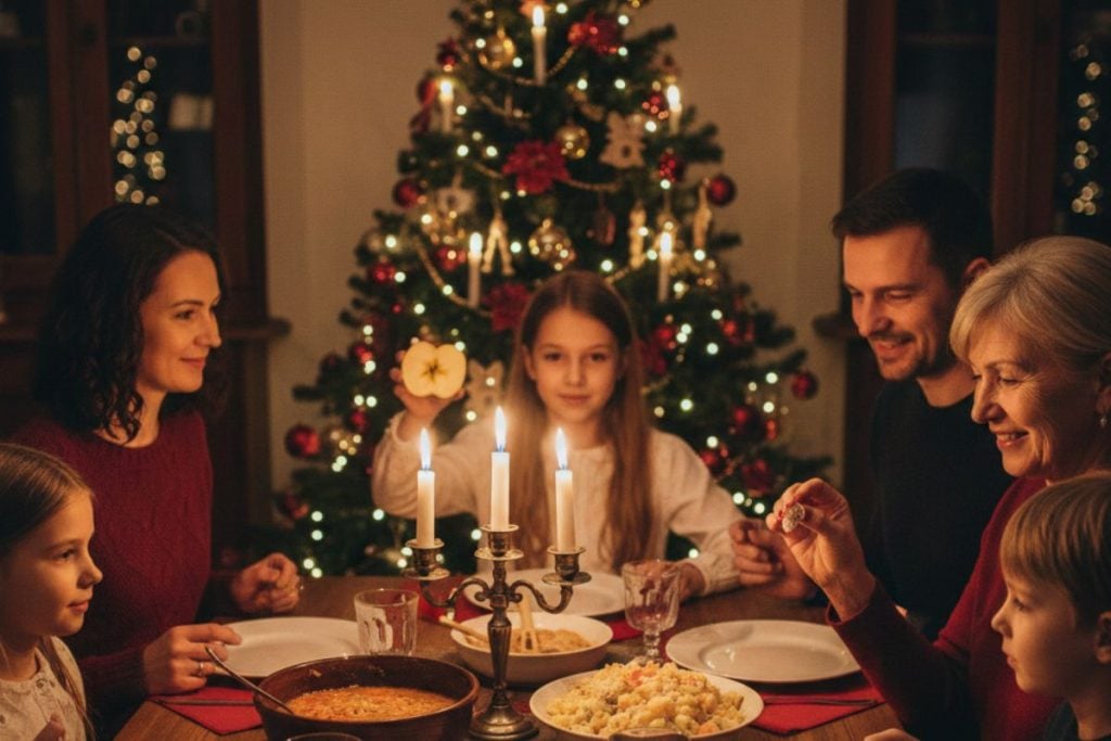 - Rituál: Na stôl sa dáva párny počet tanierov (napríklad 6), plus jeden navyše. Tento siedmy tanier je symbolicky pripravený pre pocestného, osamelého človeka, alebo pre zosnulého člena rodiny.