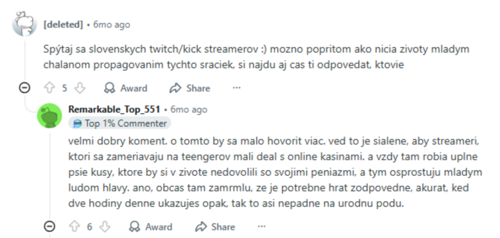 „Niektorí streameri často propagujú nelegálnych prevádzkovateľov, používajú prostriedky od nelegálnych kasín a nehrajú za vlastné peniaze, čo u mladých divákov vytvára klamlivú predstavu o nízkom riziku a vysokej návratnosti,” vysvetľuje Lenčéš. „Streameri sú častokrát odmeňovaní a platení priamo nelegálnymi online kasínami a nelegálnymi stávkovými spoločnosťami a dopúšťajú sa tak nelegálnej propagácie,” dopĺňa.