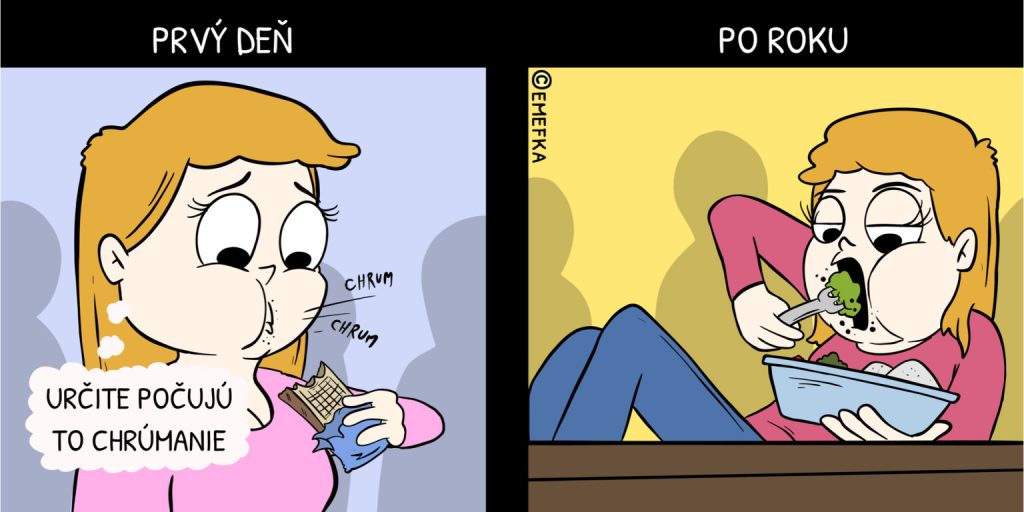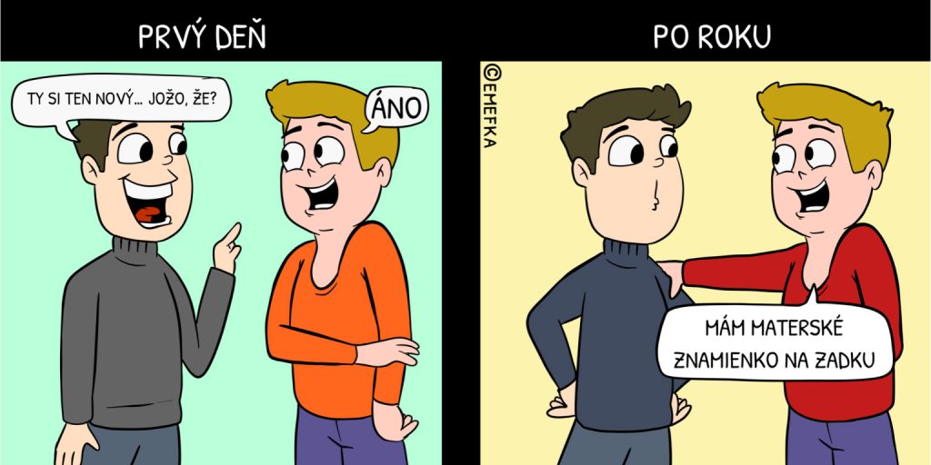 Po roku: S kolegovcami ste sa oťukali a teraz sa už bavíte prakticky o všetkom. Kto s kým spáva, komu neschválili hypotéku, aká mastička najlepšie funguje na neidentifikovateľné výrastky na prdeli… servítku si pred ústa teda rozhodne nekladiete.