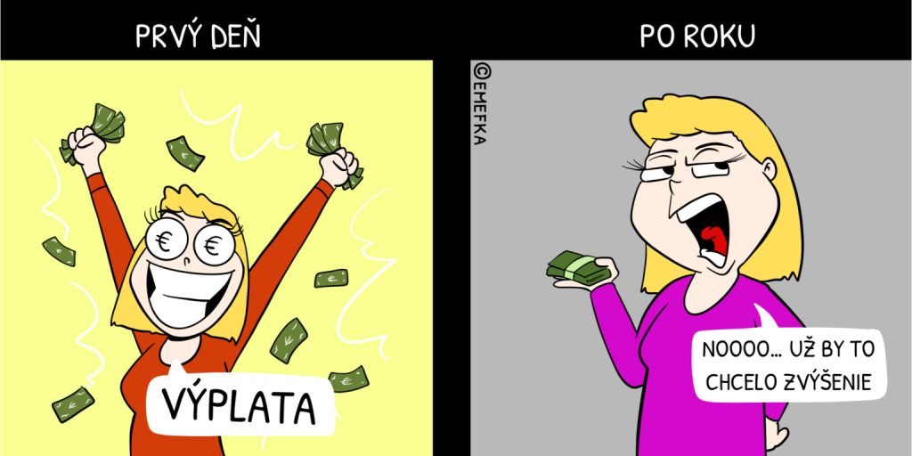 Po roku: „Pánko zarába päťcifernú sumu a nás necháva otročiť za pár drobných,“ frfleš na svojho šéfa zakaždým, keď ti cinkne výplata. Keď zaplatíš nájomné a ostatné šeky, budeš rád, keď ti ostane aspoň na instantné polievky, nieto na nejaké koníčky.