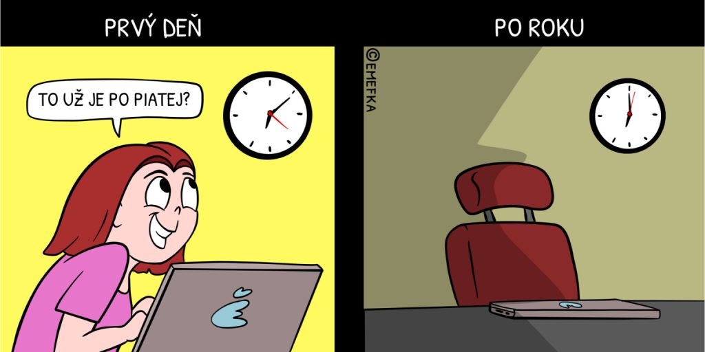 Po roku: „Od polovice sa zaokrúhľuje hore, takže pol piatej je vlastne päť. Zbohom,“ rozlúčiš sa s cynickým úsmevom na perách a už ťa niet. Pri tom plate môžu byť radi, že si vôbec prišiel.