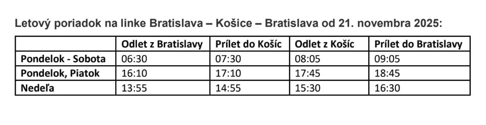 Už dávnejšie sme vedeli, že lety budú zabezpečované denne lietadlami Airbus A321 alebo A320 s kapacitou 230 sedadiel. Počas pracovných dní a soboty vzlietne spoj o 6:30 z Bratislavy a o 8:05 z Košíc, v pondelok a stredu pribudnú aj popoludňajšie lety. Nedeľné lety sú plánované na 21:00 z Bratislavy a 22:35 z Košíc.