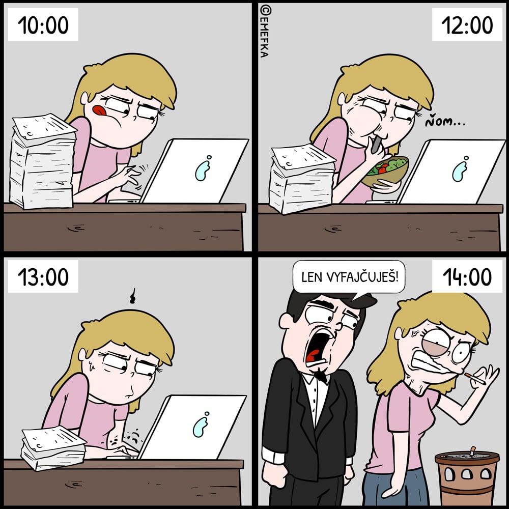 Všetci poznáme šéfov a ich selektívnu slepotu. To, že vo firme pomaly nocuješ, naháňaš sa za uzávierkami ako handra na metle a nevieš, kde ti hlava stojí – to nevidí. Ale to, že si dovolíš 5-minútovú prestávku na cigu, to si všimne okamžite.