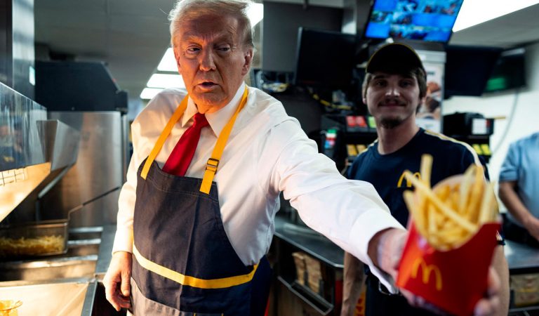Donald Trump serves fries at a McDonald’s in Pennsylvania.