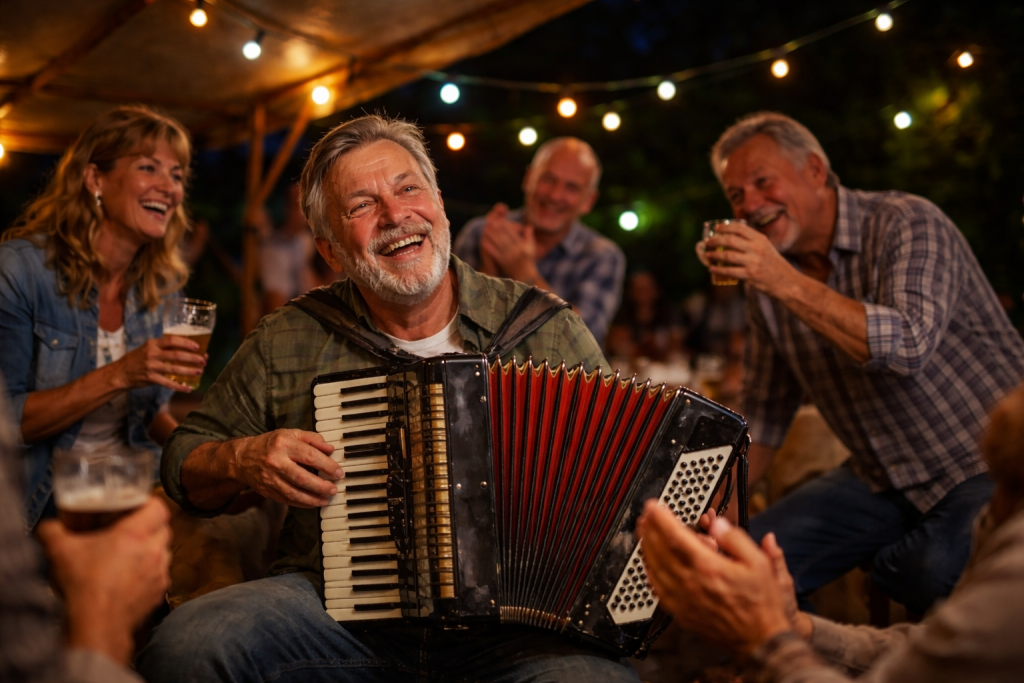 Najprv nenápadne sedí bokom a tvrdí, že hrať dnes nebude. O pár hodín však už drží harmoniku a spúšťa prvé piesne. Pozná desiatky melódií, vie presne, kedy treba zrýchliť tempo a kedy pritlačiť na emócie. Jeho „posledná pesnička“ býva takmer vždy začiatkom ďalšej polhodiny spevu. Bez neho by oslave chýbala duša. A keď niekto navrhne koniec, odpovie: „No dobre, ale už fakt len túto a ideme spať.“ Samozrejme, nikam sa nejde.