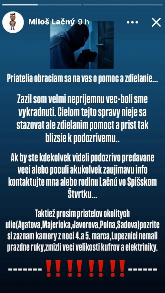 Bývalý hráč pražskej Sparty či Ružomberka o tomto traumatizujúcom incidente okamžite informoval na Instagrame. Neskrýval obrovský hnev nad tým, že niekto takto surovo narušil jeho nedotknuteľné súkromie. Podľa jeho slov zlodeji neodchádzali s prázdnymi rukami a zmizli drahé predmety o veľkosti kufrov aj špičková elektronika. Lačný zároveň požiadal verejnosť o maximálnu ostražitosť pri pátraní po ukradnutom majetku. Cena škody sa údajne vyšplhala na 15-tisíc eur.
